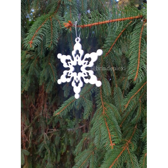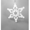 Flocon de Noël à suspendre réalisée en plexiglas et en 2D , épaisseur de la matière : 3mm ht 11 x 10 cm. Pmma traité Uv pour une utilisation intérieure ou extérieure, avec fourniture du cordon d'accroche argent.