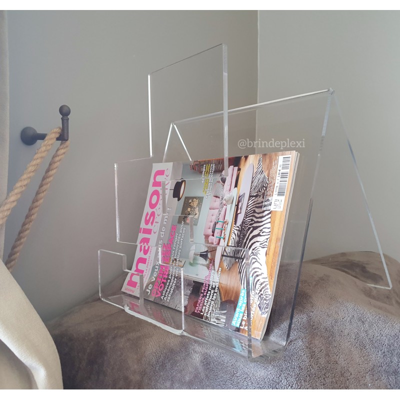Porte revue réalisé en plexiglas avec les bords polis à la main pour une jolie finition. Outre l’aspect pratique il apportera une touche singulière à votre intérieur. Il a une capacité d’environ une vingtaine de livres ou d’environ une trentaine de magazines (plus fins).