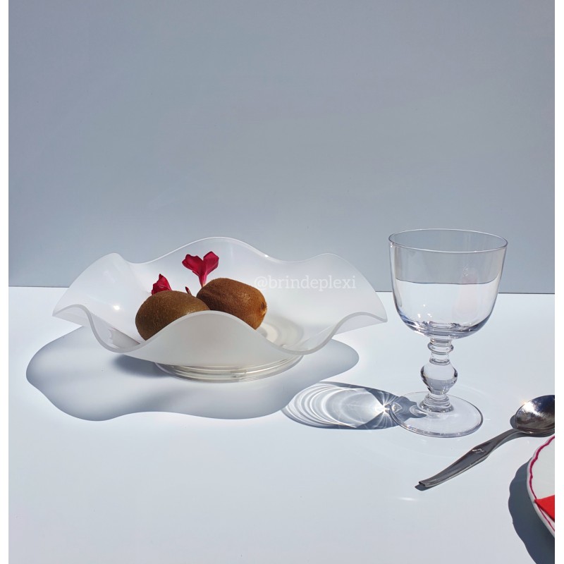 Nos coupelles sont fabriquées en plexi transparent satiné, aspect givré extérieures et brillant intérieure. Elles sont formées une à une à la main. Chaque coupelle est unique et possède ses propres lignes et ses propres courbes. Nous ne pourrons pas garantir que le produit reçu soit identique aux photos présentées. Le diamètre de ce récipient est de 30 cm. La matière utilisée est certifiée de contact alimentaire. C’est un matériau aussi joli que le verre et moins sensible à la casse.