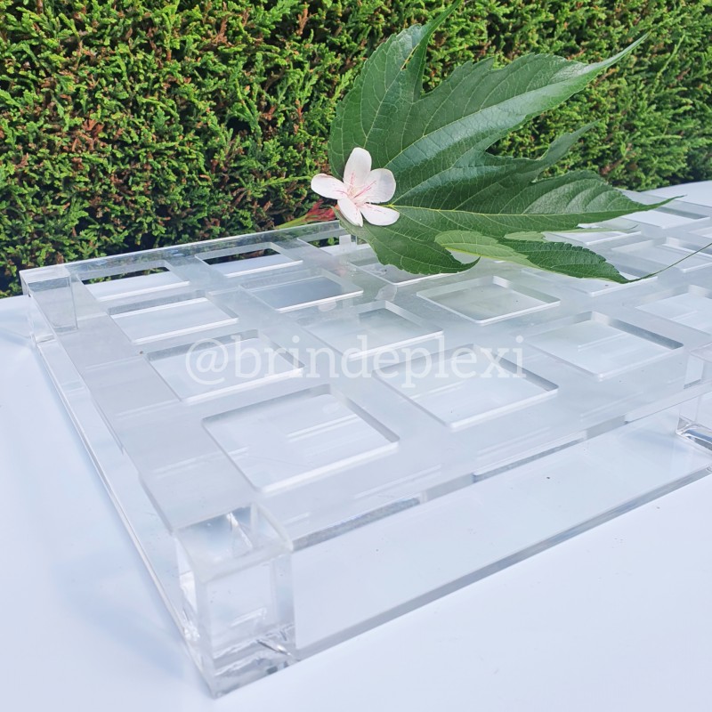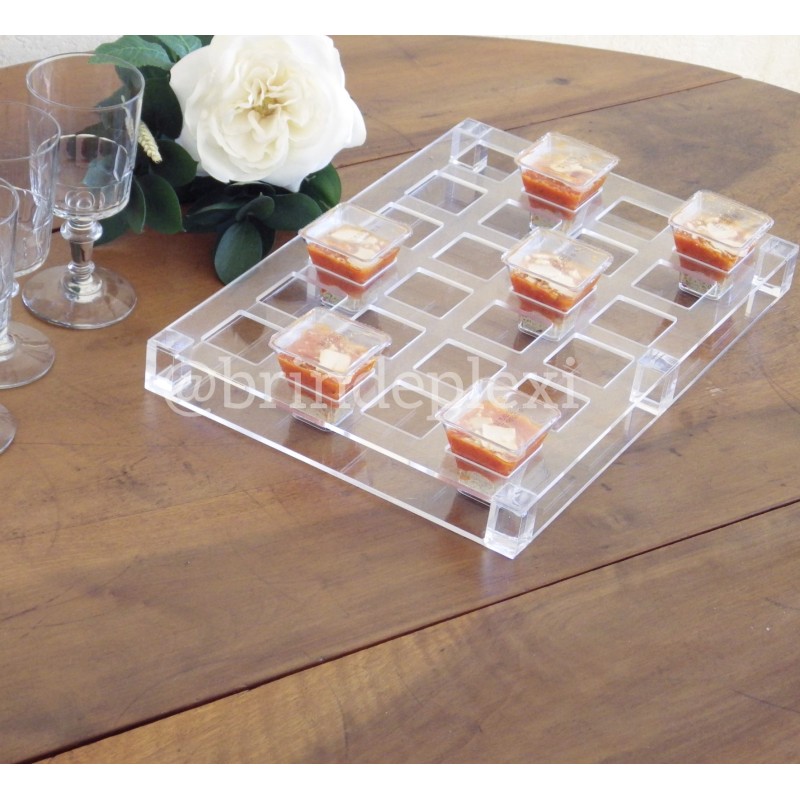 Ce support à verrine est en plexiglas transparent. Il est vendu sans les verrines mais conçu pour s’adapter à différente taille de verrines standards, ronde, carré. Les ouvertures ont une dimension de 4x4 cm avec une capacité de 20 verrines.