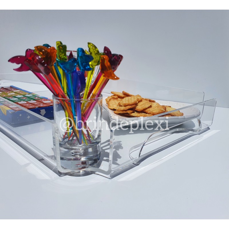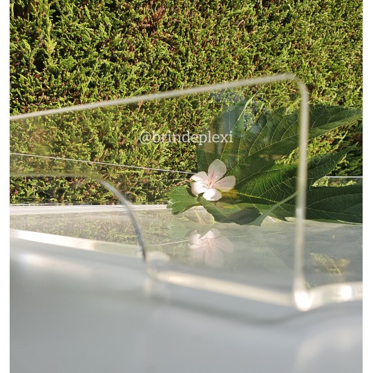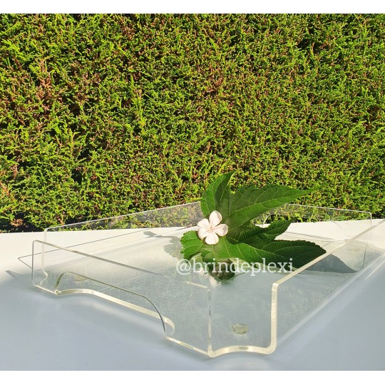 Plateau réalisé en plexiglas transparent, avec deux poignées pour le service. Les bords sont arrondis, polis et les arrêtes abattues pour un meilleur confort.